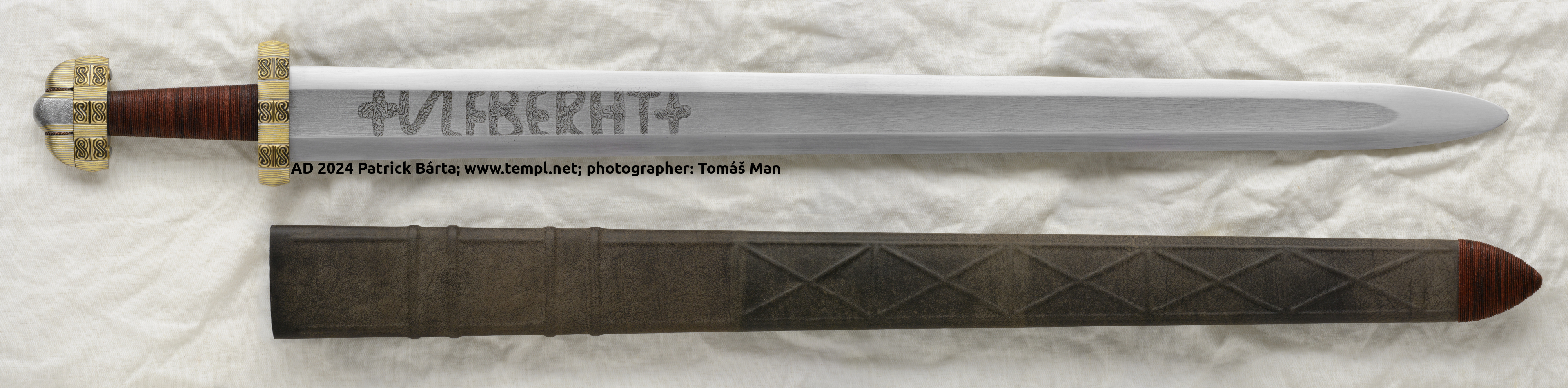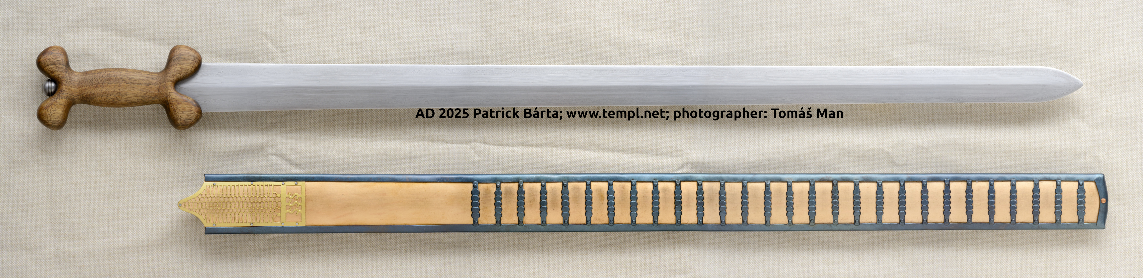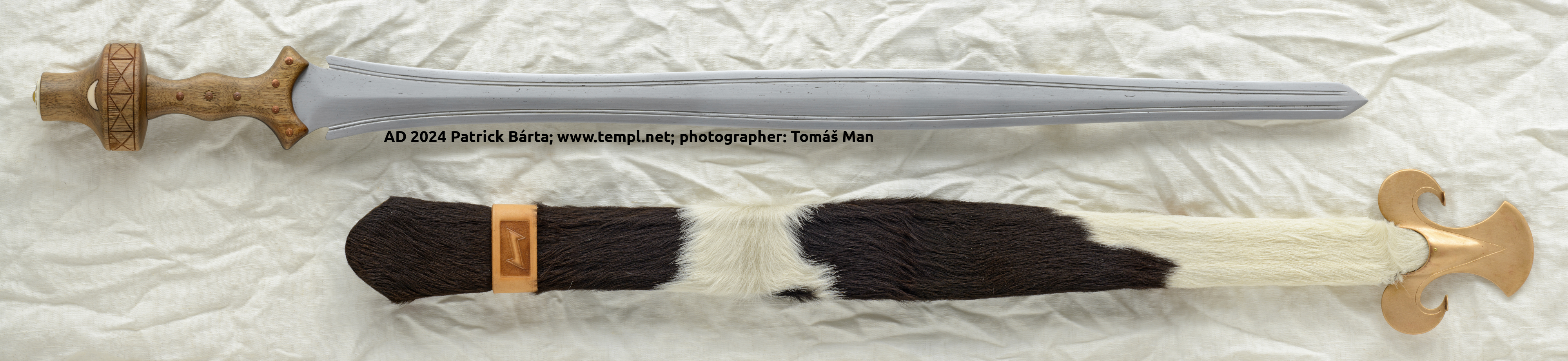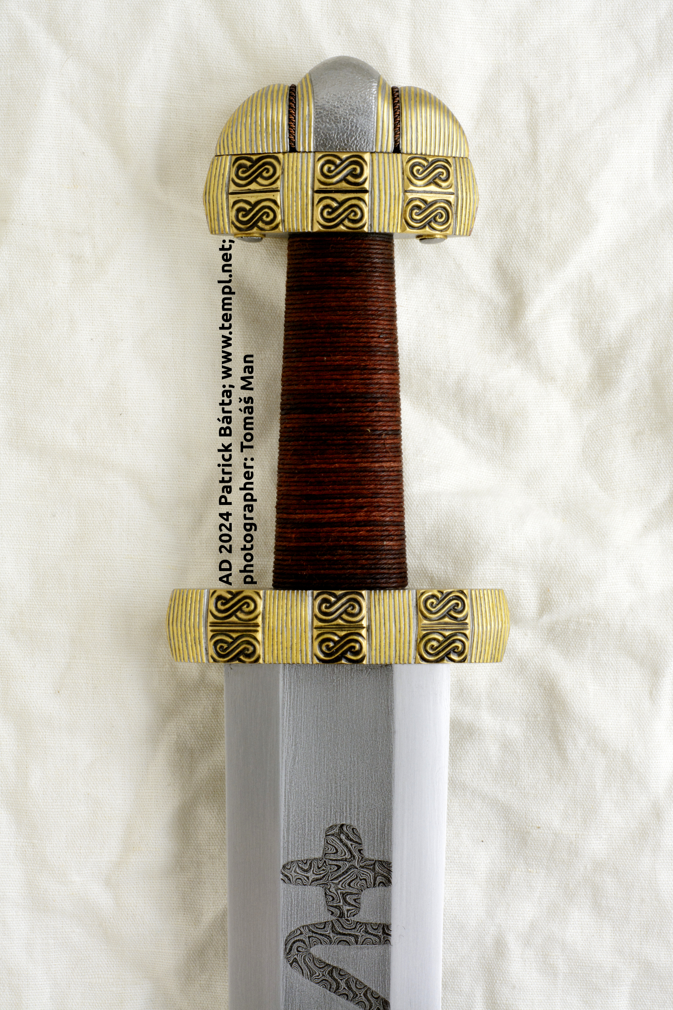 - Čepel s měkčím středem a oboustranně navařeným ocelovým ostřím je ve žlábku zdobená zlatým tauzovaným křížkem. Železná rukojeť je pokryta celoplošnou bimetalickou tauzií stříbrným a mosazným drátkem.