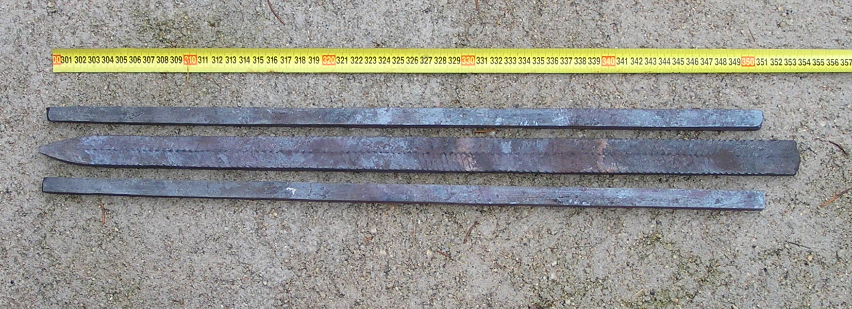 obr. 1 – Damaskový střed čepele meče a dvě tyče ostří před závěrečným svařením
