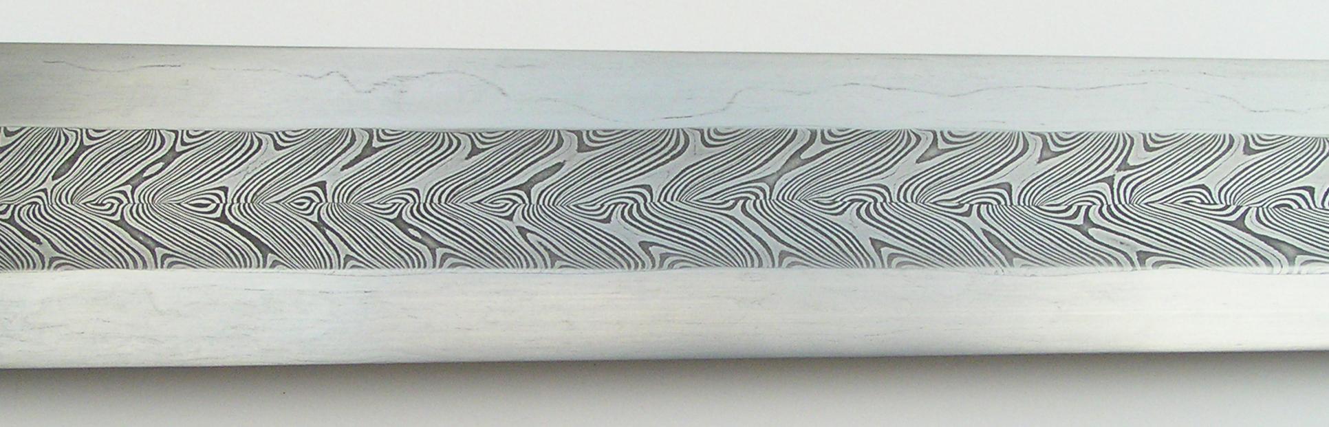 výsledný "V" vzor na povrchu vyleštěné a vyleptané rekonstrukce čepele meče z 9.stol. ze Starého Města, ČR