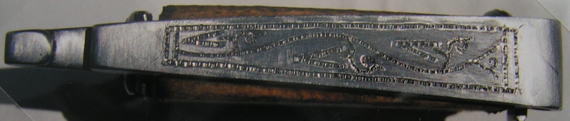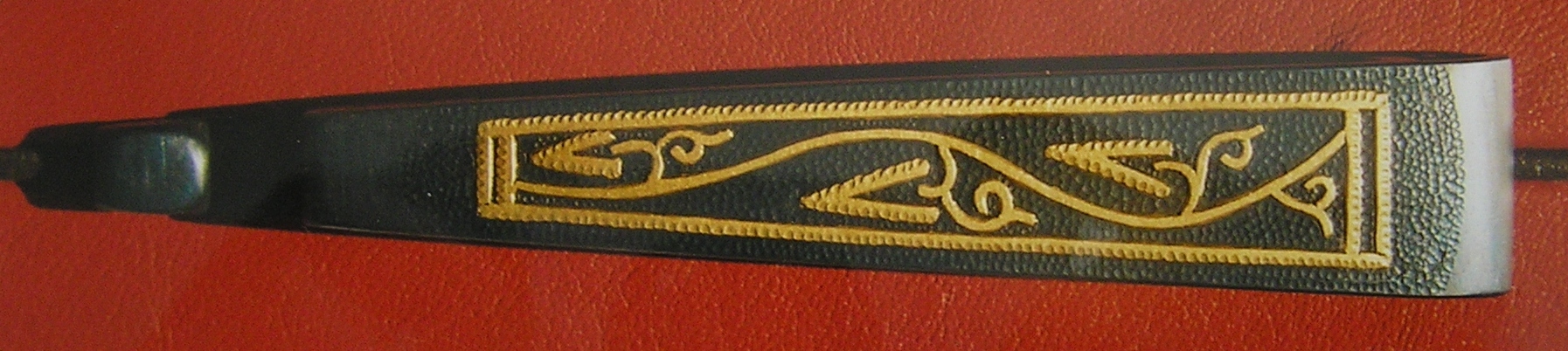 obr. 4 – Hotová rekonstrukce zlaté tauzie s patinovaným železným podkladem na kování pochvy římského meče z počátku 3. stol. z Vimose, Dánsko