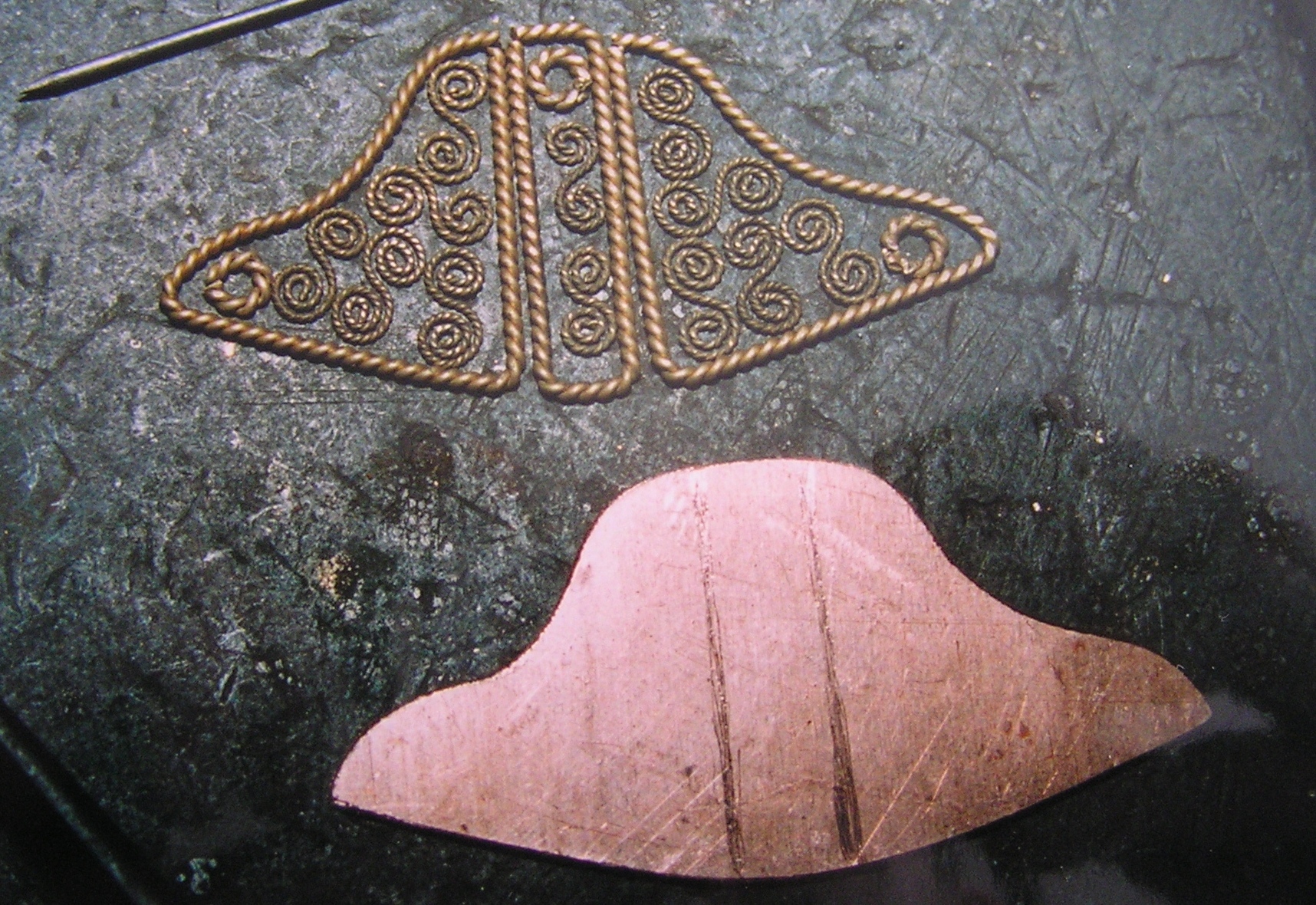 V prosté variantě této techniky je na povrchu spodiny vyskládán z drátků zamýšlený ornament (viz. obr. 5) a poté je připájen pájkou (v práškové formě s tavidlem, např. boraxem) za teploty kolem 800 °C. Celek je pak vytvarován a vyleštěn (viz. obr. 6).