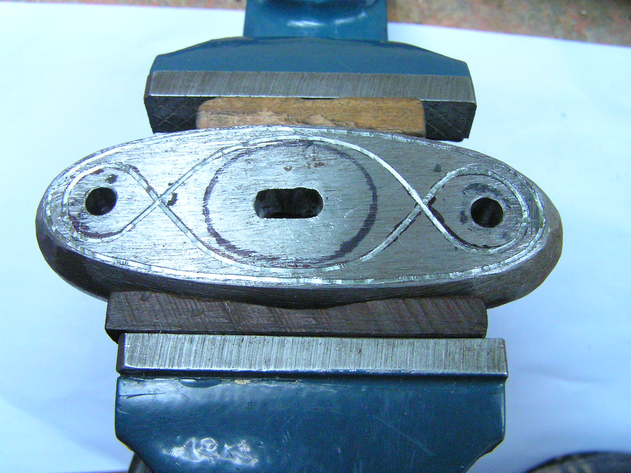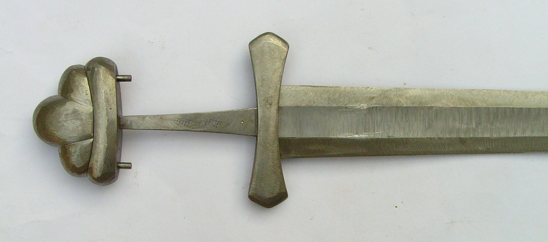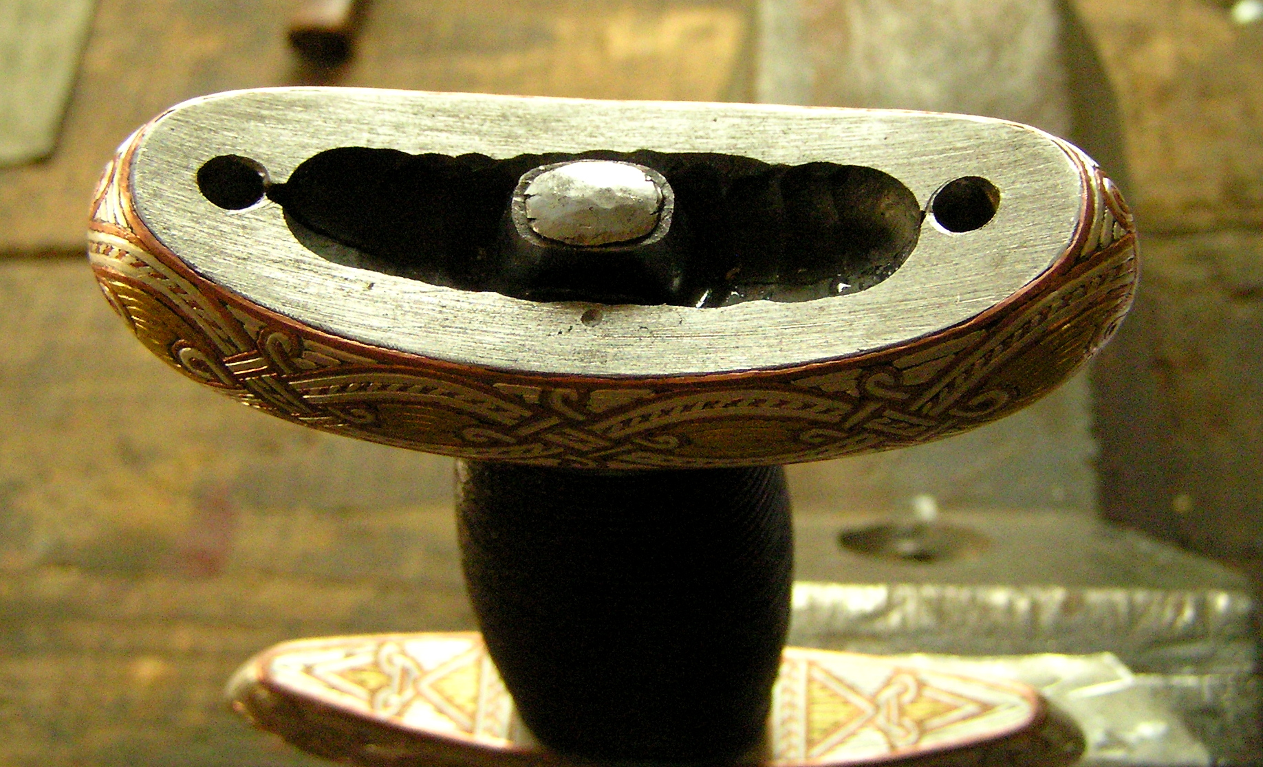 - Rukojeť meče byla ve shodě s originálem vyrobena jako masivní železná záštita a kovaná částečně dutá horní příčka. Hlavice, která na originálním meči chybí, byla vykována podle jedné z nejbližších analogií (Blistava, Ukrajina) z masivního železa s proseklou dutinou uprostřed (viz obr. 9) a s upevňovacími nýty pájenými mědí. Všechny tři části rukojeti byly hrubě opracovány pilníkem a napasovány na čepel (obr. 10).