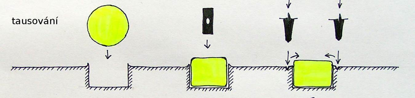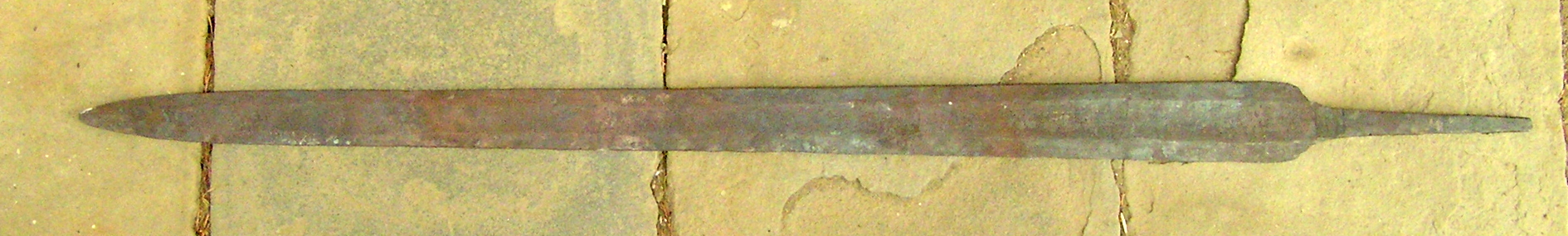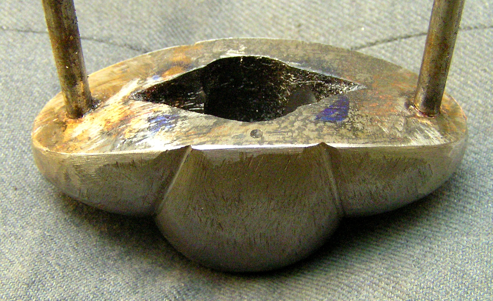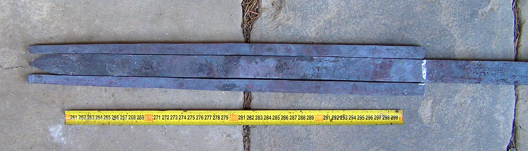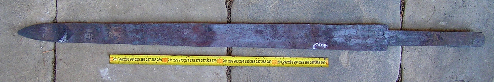 - Na měkčí železné tělo byly navařeny obě ocelová ostří (obr. 6-7) a z tohoto předkovku byl vykován finální tvar čepele (obr. 8), který byl po hrubém opracování zakalen do vody.