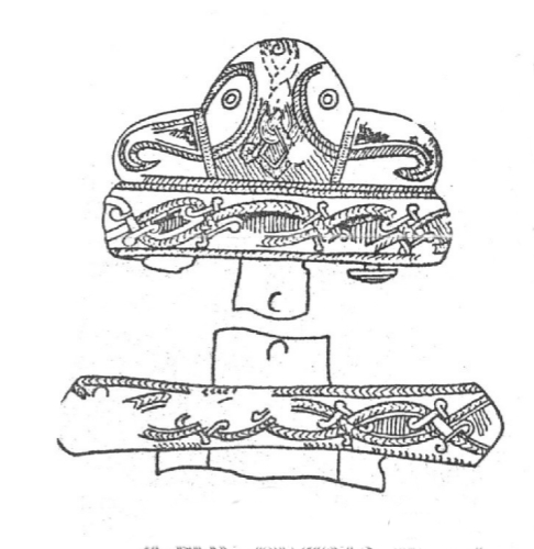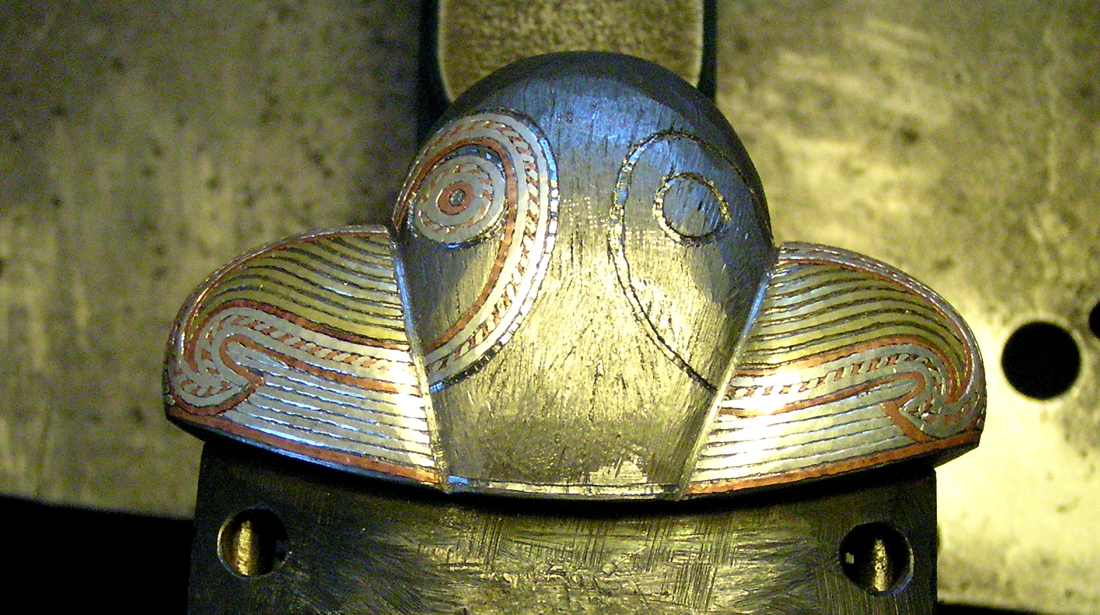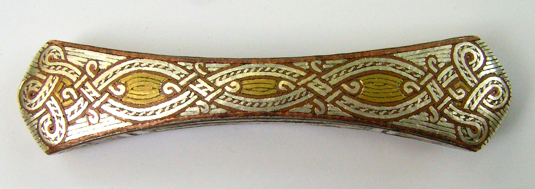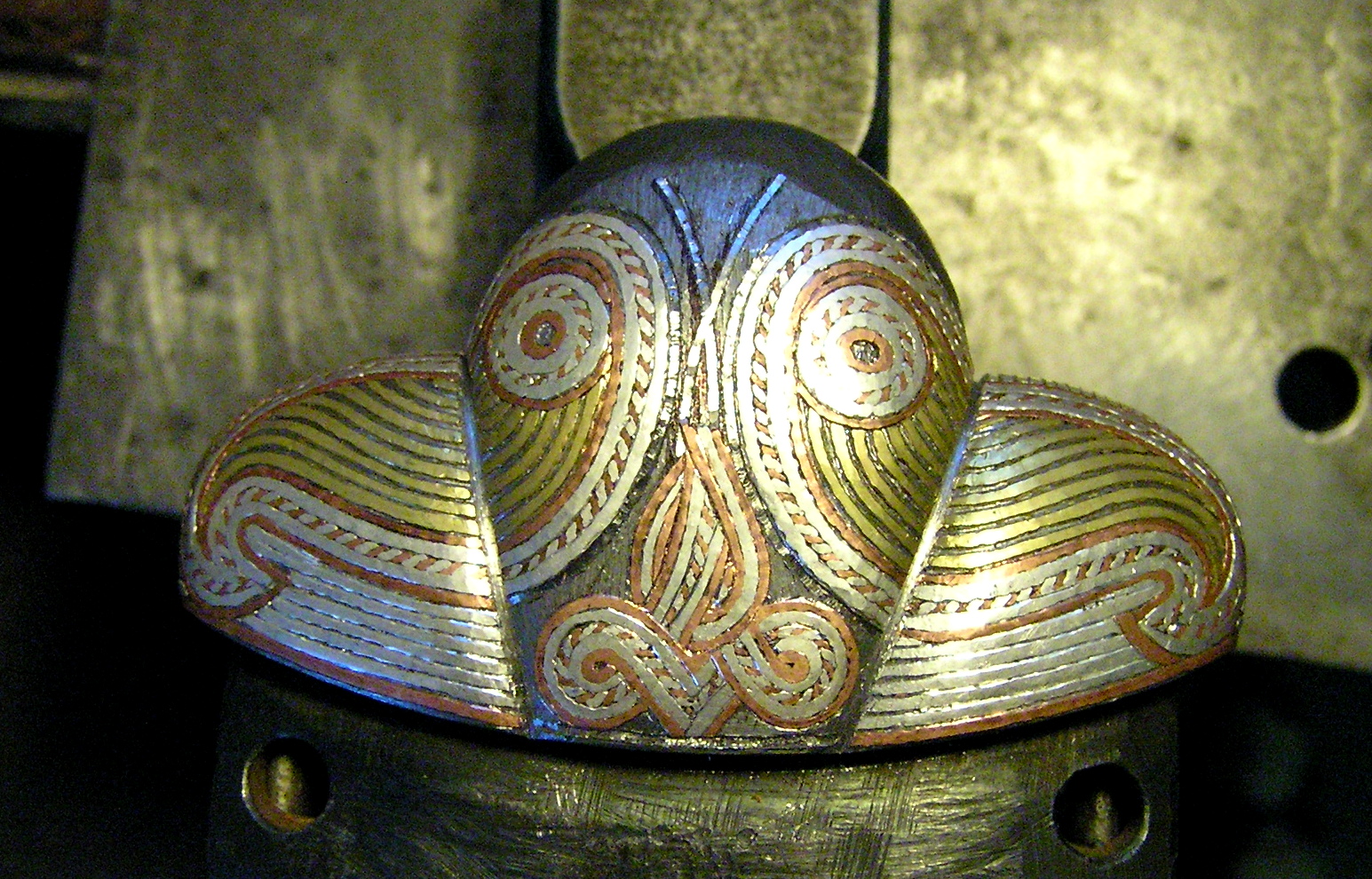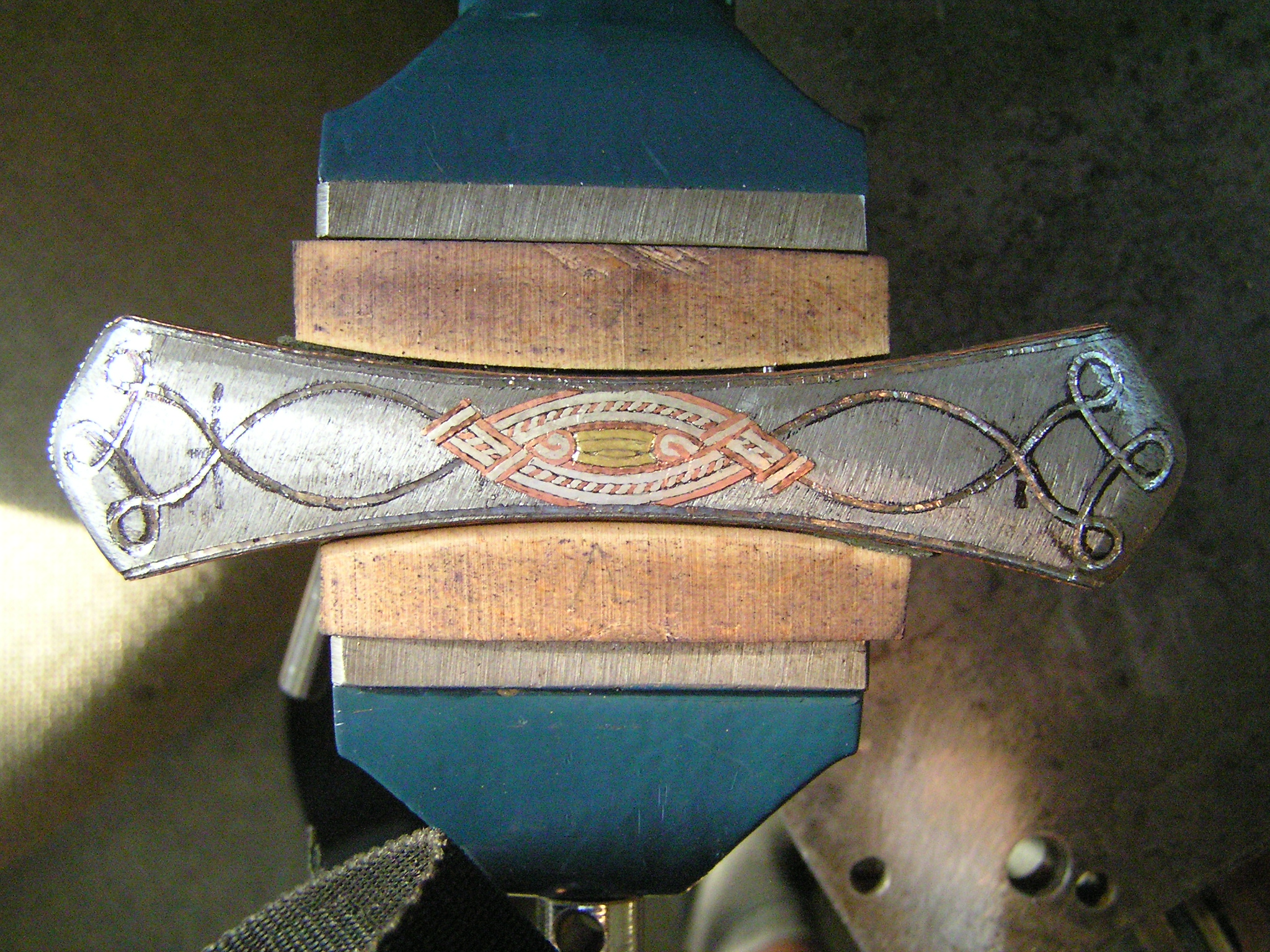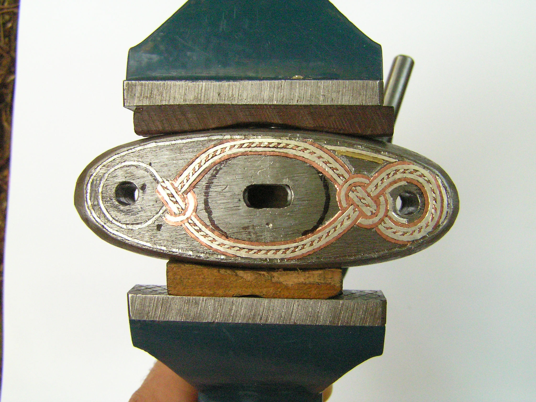 - Výzdoba rukojeti sestává z pletencového motivu, jehož základ z dohromady zkrouceného měděného a stříbrného drátu byl pravděpodobně do železné spodiny tauzován (technika, kdy vložka z ušlechtilého kovu je umístěna do pro tento účel vytvořeného otvoru, či drážky, a je kladívkem rozklepána, čímž dojde k jejímu mechanickému rozepření v otvoru – viz obr. 11), většina ostatních ploch byla pokryta dráty (měděným, mosazným a stříbrným) nakovanými přímo na zdrsněný povrch technikou tzv. plátování. Motiv dvou ptačích hlav a pletence na hlavici byl převzat z analogického meče z Ukrajinské Blistavy (obr. 12) Postupná tvorba výzdoby viz obr. 13-18.