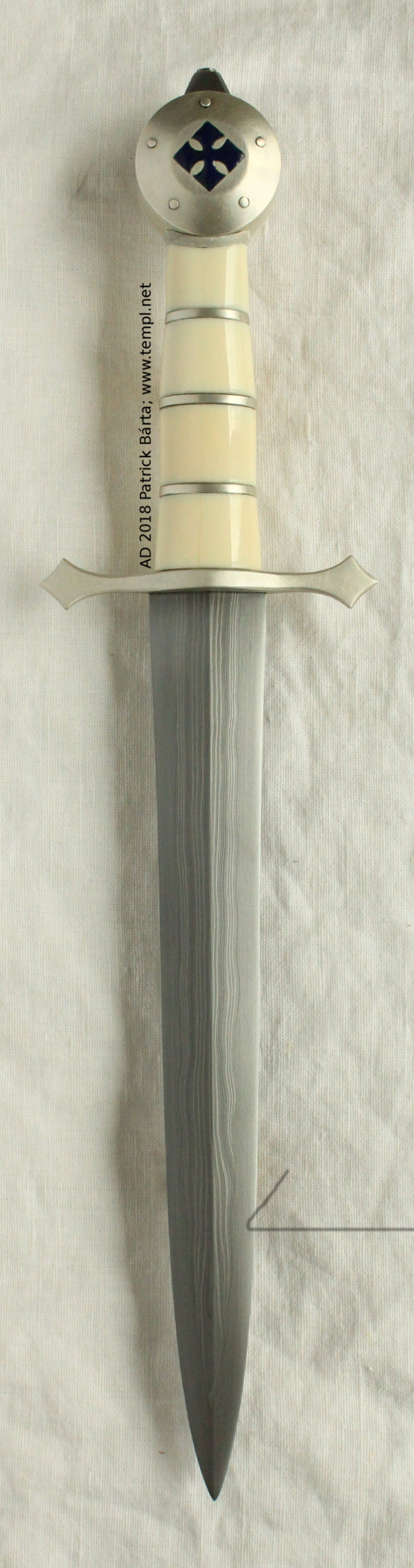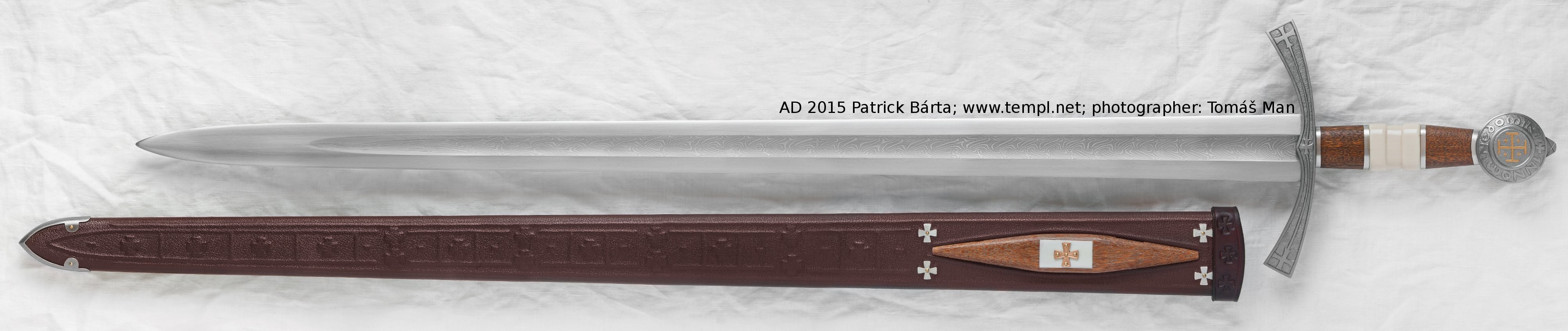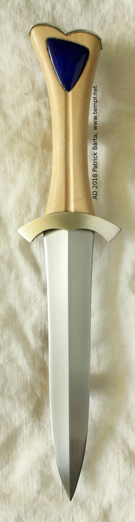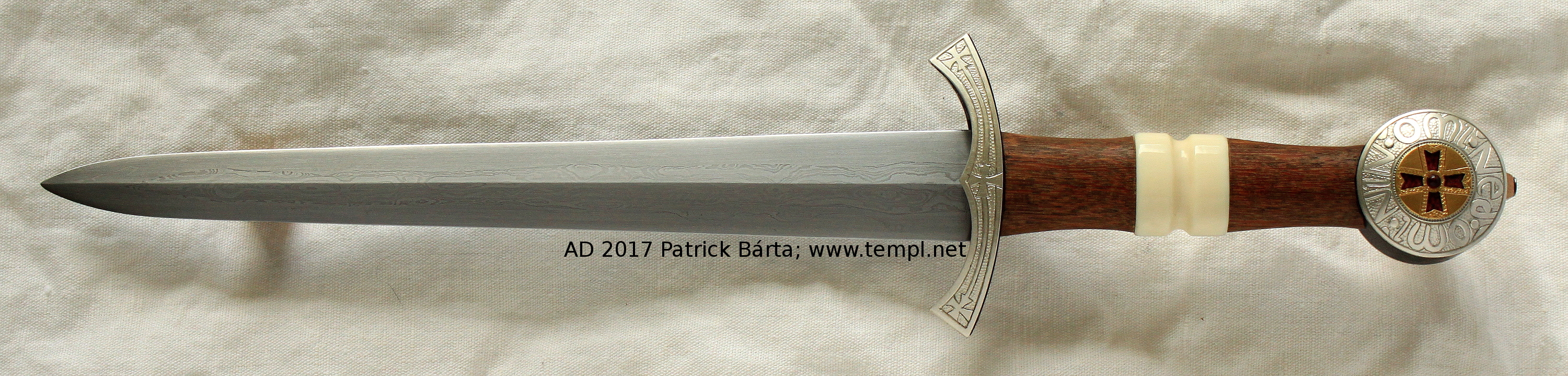 - pattern-welded blade, hilt from gold inlayed iron, in the centre of pommel is emerald